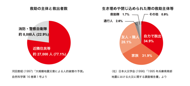 しかし想定されているような巨大地震が発生した場合、公助はほとんど機能しないと言われています。下記は阪神淡路大震災のデータですが、生き埋め閉じ込められた方の救助主体は約97%以上が「自助・共助」でした。