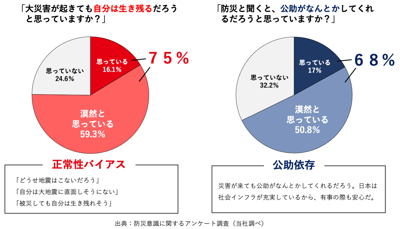 首都直下地震、南海トラフ巨大地震が70〜80%の確率で発生すると言われ始めてから10年が経過し、国民一人ひとりが危機意識を持つことが出来ていない現状があります。また、自然災害においては「公助」がなんとかしてくれるという先入観を持っている方が多数存在し、発災の瞬間に適切な行動を取るための教育が不足している課題があります。