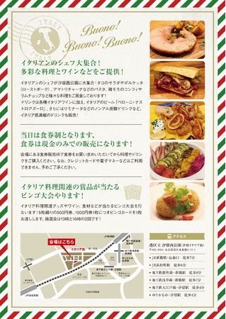 またステージイベントとして13時と16時の2回、イタリア料理関連グッズやワイン、食材などが当たるビンゴ大会を開催!多くの賞品をご用意しておりますので奮ってご参加ください。