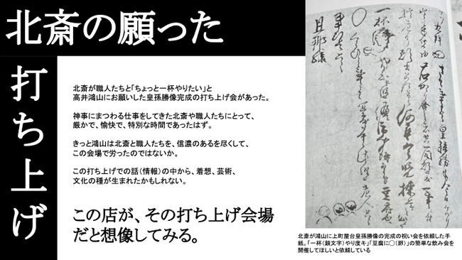 江戸時代。小布施にいた葛飾北斎が職人たちと「ちょっと一杯やりたい」と、パトロンだった小布施の豪農商 高井鴻山にお願いした祭屋台の皇孫勝像完成の打ち上げ会がありました。祭屋台という神事にまつわる建築物の仕事をした北斎と職人にとって、この打ち上げ会は、厳かで、愉快で、特別な時間であったはずです。きっと鴻山は、そんな北斎と職人たちを、信州のあるを尽くして、この会場で労ったのではないでしょうか。この打ち上げでの話(情報)の中から、着想、芸術、文化の種が生まれたかもしれません。その打ち上げ会の会場が、この建物だったらどうだろうと考えました。そんなところから、1階に訪れる人のために飲食を提供するスペース、2階に小布施・北斎をテーマとしたアート作品を展示・販売するスペースを設けることになりました。