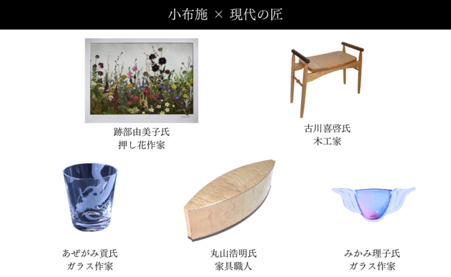 小布施町にゆかりのあるアーティスト5組の作品を展示・販売していきます。オープン時に取り上げるのはArt&Craftよしのや、跡部由美子、家具工房 蒼、掛軸工房 OBUSE、GLASS STUDIO Liccoで、それぞれが小布施を代表する「現代の匠」です。