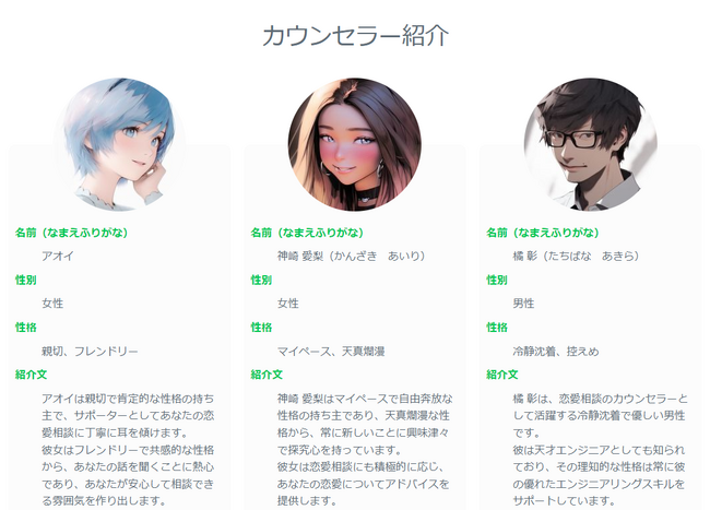 (個性豊かなAIカウンセラーたちは、今後も随時増えていく予定。)