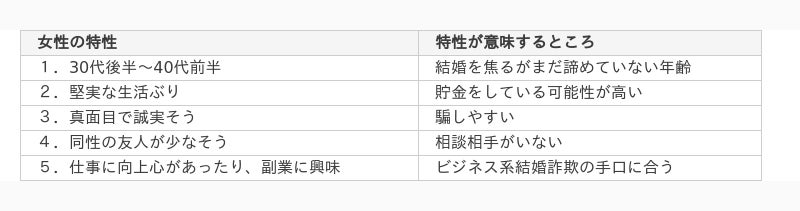 - ユーザー年齢層が高く、結婚詐欺のメインターゲットである30代後半〜40代前半の女性が豊富にいる。
