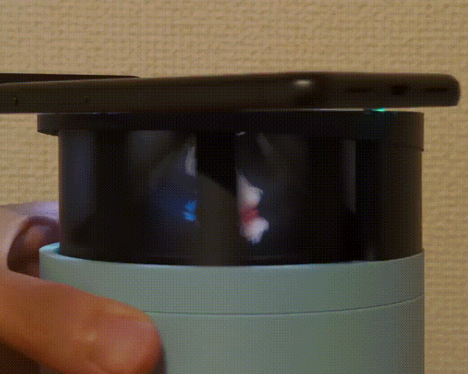 エポメトロープミニは、スマホに表示された映像を本体に搭載された回転する特殊形状のミラーに反射させることで、視野角約180度の立体映像を実現できます。