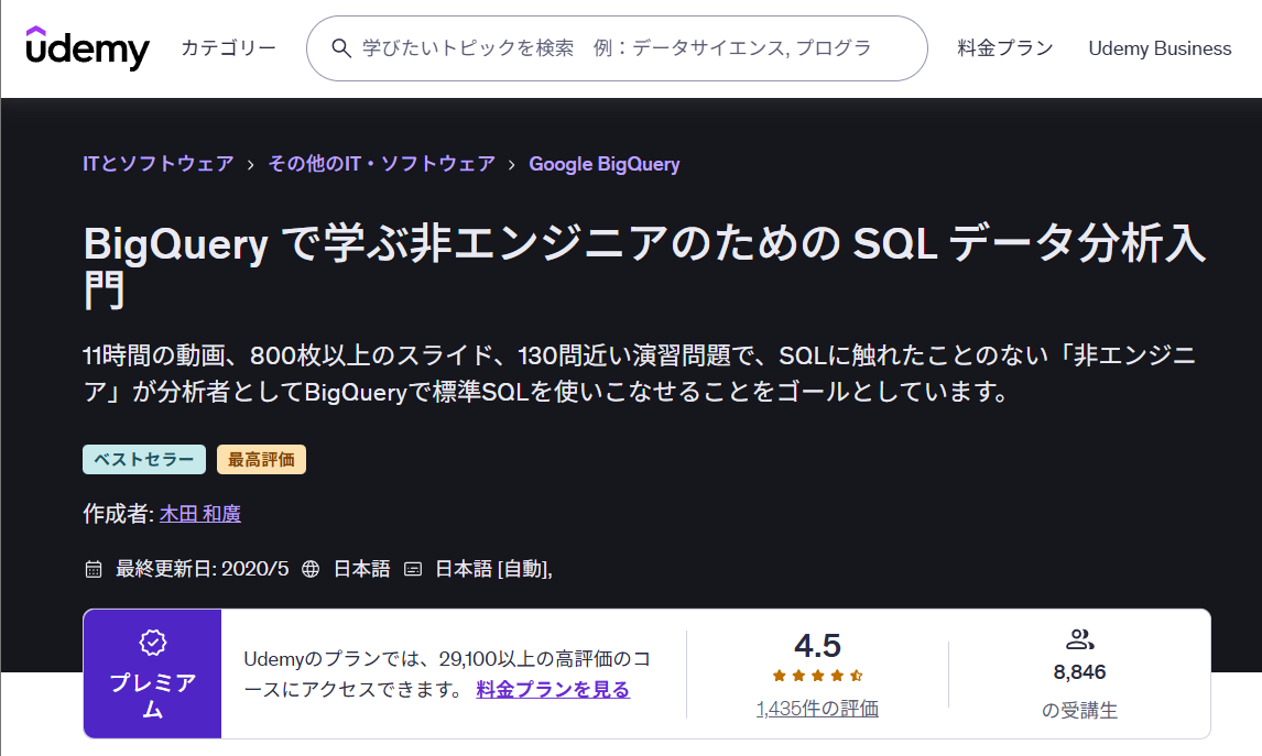 Udemyで展開するのSQL講座「BigQueryで学ぶ非エンジニアのためのSQLデータ分析入門」