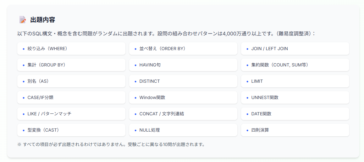 - 「抽出(SELECT)」能力に特化: ビジネス職には不要な「データベース構築(CREATE/INSERT)」等の知識は問わず、データを取り出し、加工・集計する能力(SELECT文)のみを深掘りして判定します。
