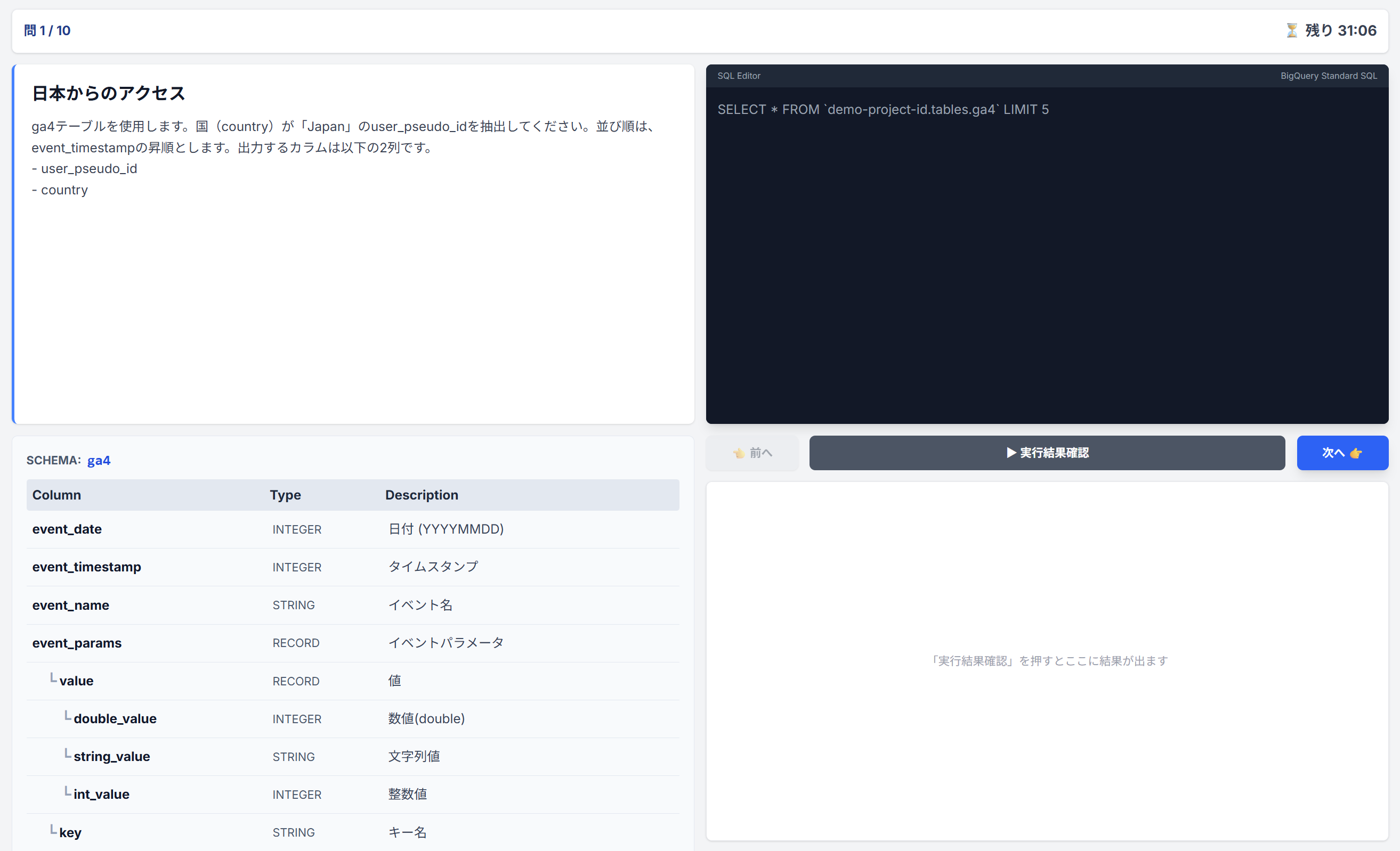 - 実践的データ: 教科書的な、「製品別の数量、売上、利益」といったダミーのテーブルに対してだけでなく、GA4ログやGoogle Search Console等のリアルで実践的なデータを対象にSQLスキルを測定できます。