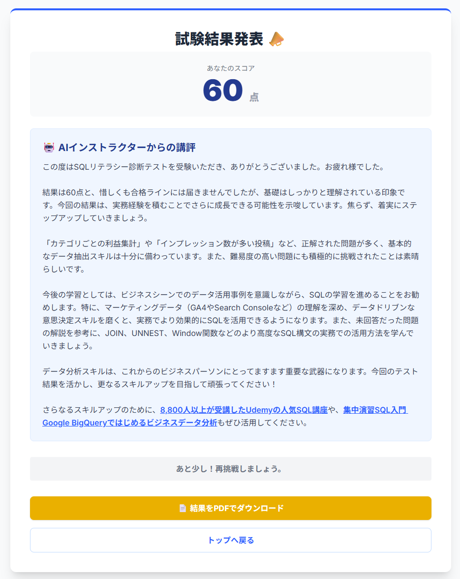 - AIフィードバック: 生成AI(Gemini)が、受験者の書いたクエリを分析し、個別の改善点をフィードバックします。受験者は自身のスキルについて客観的な講評と今後の学習ポイントを得ることができます。