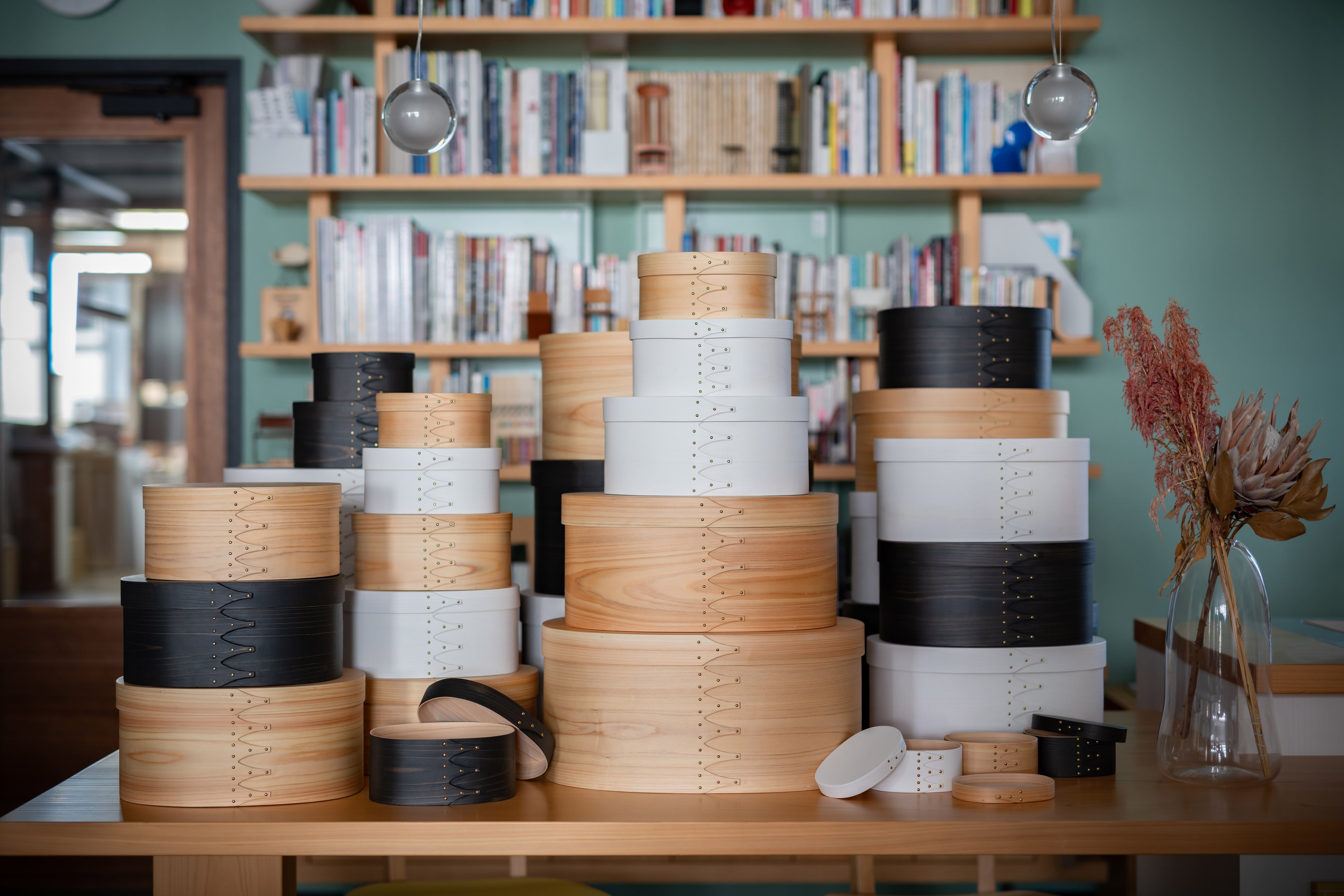 ストイックなシェーカー教徒の美意識が込められたオーバルボックスは、つばめの尾のような継ぎ目がとても印象的。茨城県産のヒノキの木地色 、黒、白の3色は発色も美しい。浮造りというフィニッシュで触感にもこだわり、まさに“神は細部に宿る”との名言を思い起こさせる。