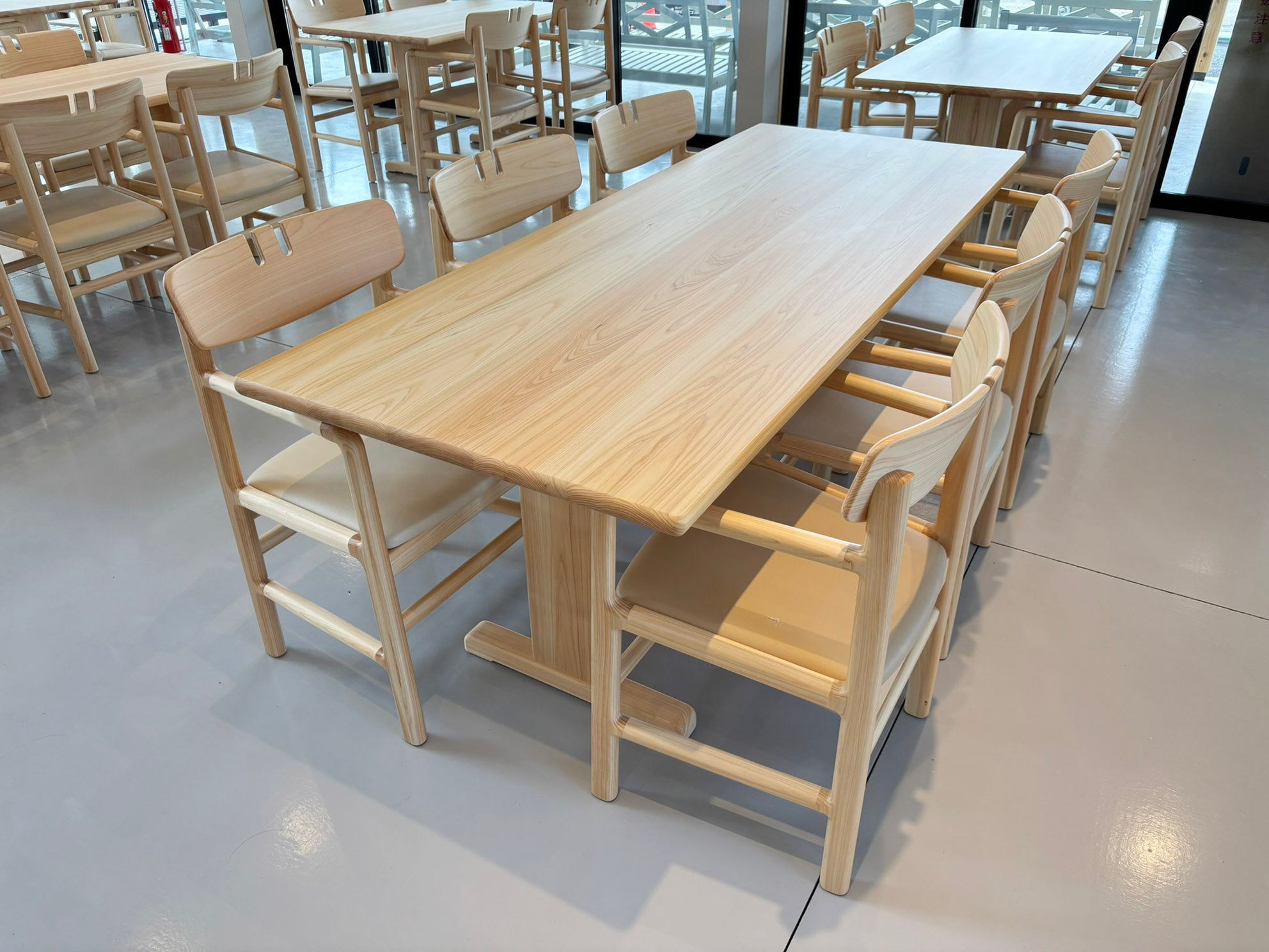 茨城県産ヒノキを使い、地域の林業や経済にも貢献できるモデルとして企画されたのが「Botanical chair」です。2025年11月にリニューアルオープンした植物園【THE BOTANICAL RESORT RINNE】内のレストランで採用されたモデルです。自然と心地よく調和する佇まいを追求し、直材中心のシンプルな構造に、継手のカーブで柔らかな表情を加えました。県産材を県内で加工・製造し、再び県内施設へ届ける循環は、環境負荷の低減と地域活性化の両面から価値を生み出すものであり、単なる家具に留まらないサステナブルなモデルとして位置づけられています。