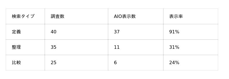 といった定義検索では、複数の情報を要約して説明するAI Overviewの仕組みと相性が良く、高確率で表示される傾向が見られました。