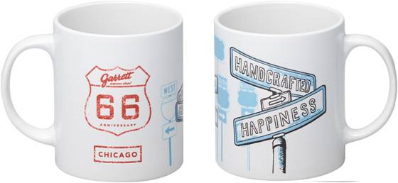 「Garrett 66缶」は、シカゴからスタートした「ギャレット ポップコーン ショップス(R)」1号店(※)の近くに位置するアメリカの国道線「Route 66」と「ギャレット ポップコーン ショップス(R)」の66周年をかけて制作されており、米国と日本で同様のデザインを使用する、初の日米合同デザイン缶です。「Garrett 66缶」のデザインをモチーフにしたマグカップ(1,200円)も数量限定で発売します。※現在は閉店しています。