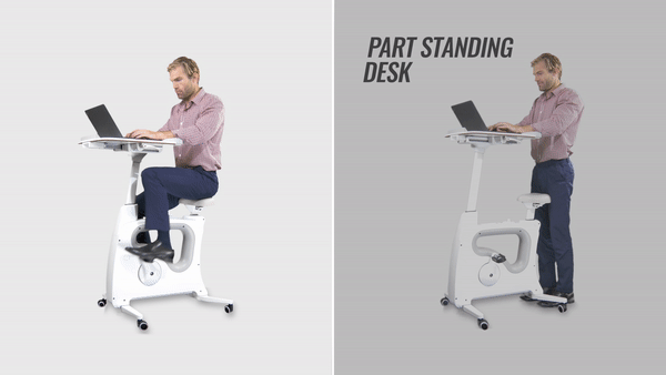 特徴として机部分の高さ調節が瞬時にでき、さらに前後の調節も可能で、時にはスタンディングデスクとしても使えます。またバイクの椅子部分にも引き上げだけで上下できる調節レバーが付いています。