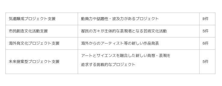 その一環である、「Tokyo Tokyo FESTIVAL助成」では、東京都が主導する文化プログラムの考え方(※)を踏まえ、芸術文化都市東京の魅力を一緒に作り上げる、芸術団体、民間団体、企業等が実施する様々なプロジェクトを支援しています。当助成は、「気運醸成プロジェクト支援」「市民創造文化活動支援」「海外発文化プロジェクト支援」「未来提案型プロジェクト支援」という4つのカテゴリーを設置し、採択事業の経費の一部を助成することで、2020年に向けてより多くの人々のTokyo Tokyo FESTIVALへの参加促進、2020年以降の東京の芸術創造環境の向上を目指します。