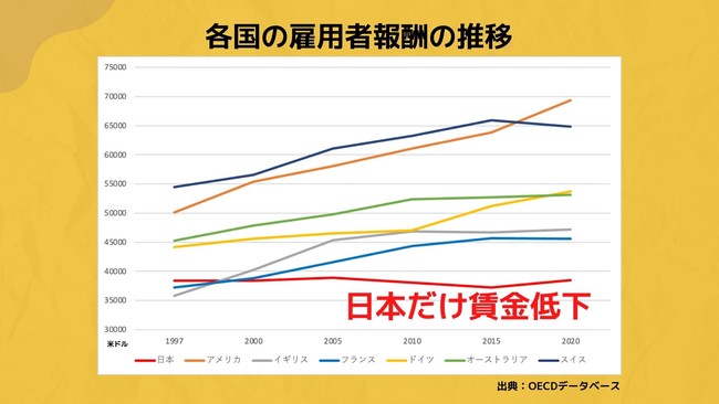 1997年以降、日本以外の先進国の賃金は上昇トレンドにあるのに対し、日本の賃金だけが下がり続けています(※3)。