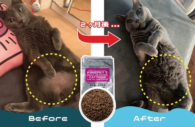お腹や尻尾などの毛が一部抜けすぎて、ノミが原因?と思ってカーペット変えたり、市販の薬を飲ましたり試したけど改善しませんでした。そんな時に、ファインペットに出会い食事が変わったことで、とにかく毛がふさふさになって、毛並みも改善して感動しました。