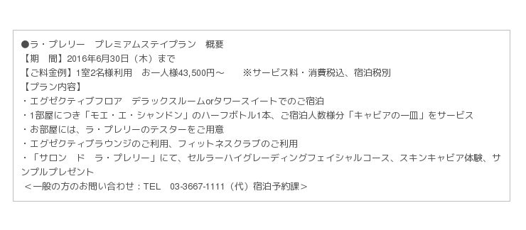 ロイヤルパークホテル(所在地:中央区日本橋蛎殻町2-1-1、総支配人:笹井 高志)では、「ラ・プレリー プレミアムステイプラン」を2016年6月30日(木)まで販売しています。