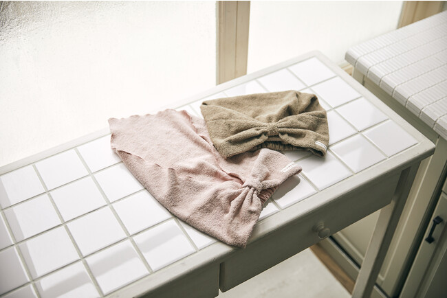 水気をしっかり吸収しながらも、お洗濯の手間にも配慮した軽やかで心地いい着心地。セットのヘアキャップは、濡れている髪にさっとかぶって手軽にタオルドライができ、スキンケアの合間にも便利なアイテムです。