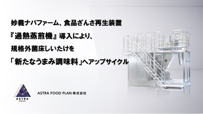 「サスティナブルな社会の実現」をミッションに掲げるフードテックベンチャーのASTRA FOOD PLAN 株式会社(埼玉県富士見市、代表取締役:加納 千裕 以下ASTRA FOOD PLAN)は、食品の乾燥殺菌装置『過熱蒸煎機』が、しいたけ生産を行う農業法人、有限会社 妙義ナバファーム(群馬県安中市、代表取締役:黛紀昭 以下ナバファーム)に導入されたことをお知らせします。