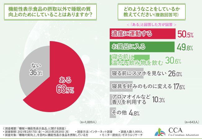 「機能性表示食品の摂取以外で睡眠の質向上のためにしていることはありますか?」と質問したところ、6割以上の方が『ある(63.7%)』 と回答しました。