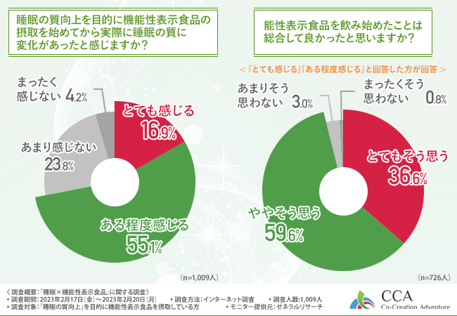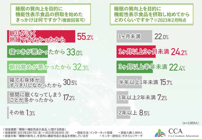 株式会社CCA(本社所在地:山梨県甲府市、代表取締役:佐野 信也)は、「睡眠の質向上」を目的に機能性表示食品を摂取している方を対象に、「睡眠×機能性表示食品」に関する調査を実施しました。
