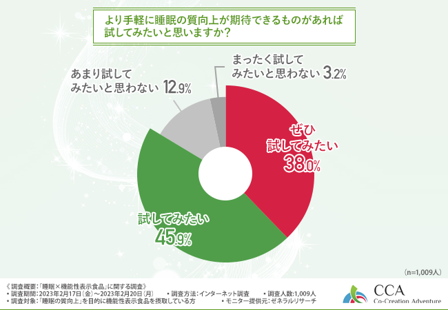 そこで、「より手軽に睡眠の質向上が期待できるものがあれば試してみたいと思いますか?」と質問したところ、『ぜひ試してみたい(38.0%)』『試してみたい(45.9%)』『あまり試してみたいと思わない(12.9%)』『まったく試してみたいと思わない(3.2%)』 という回答結果になりました。
