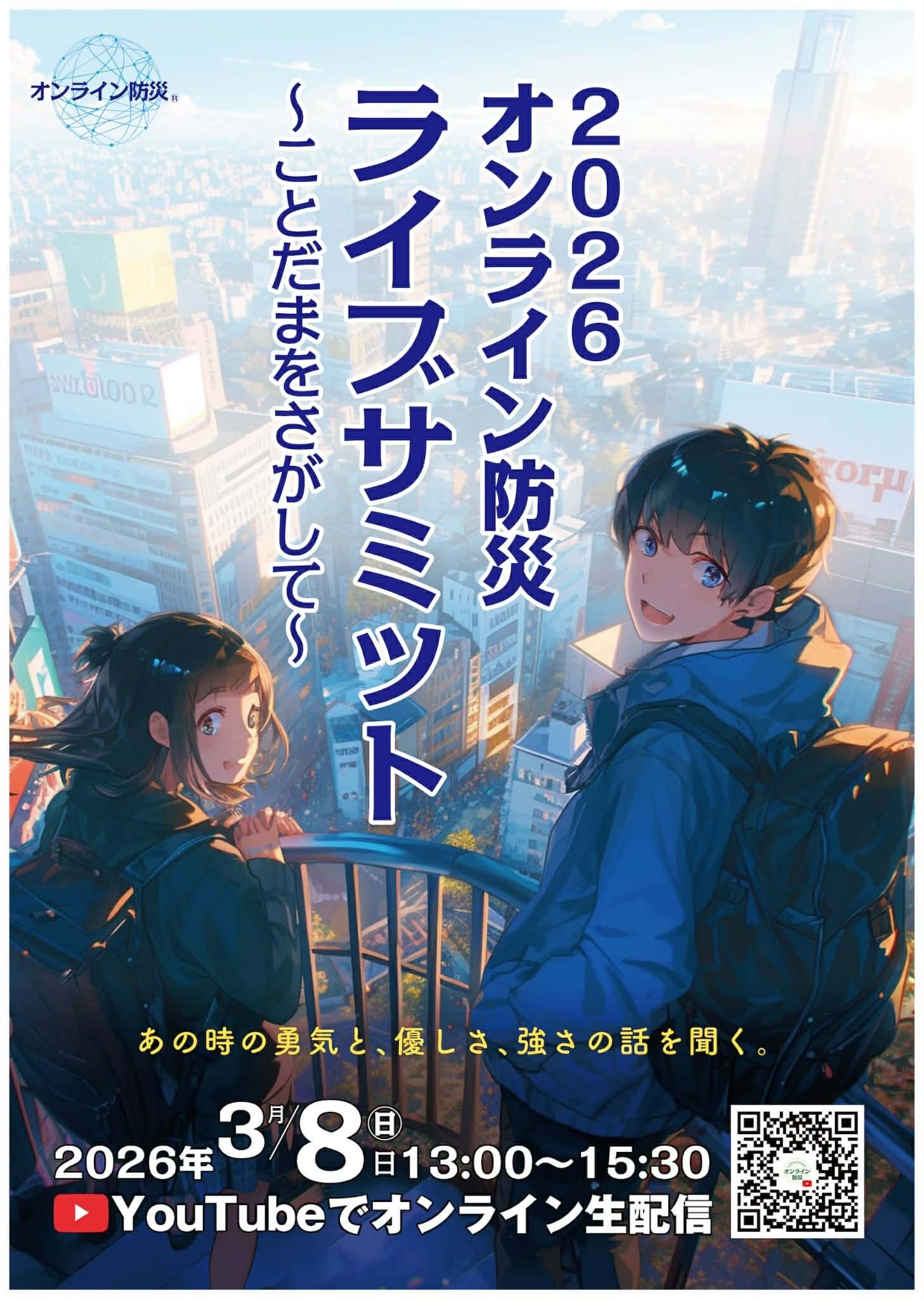 大震災の教訓を未来に繋ぐため新型コロナウイルス感染拡大を機に発足した「オンライン 防災」は、災害の記憶を風化させないために、そして「自分と大切な人のいのちを守る」行動を広げるために、2026年3月8日(日)13時よりオンライン防災2026ライブサミット〜ことだまをさがして〜 をYouTubeライブにて開催します。