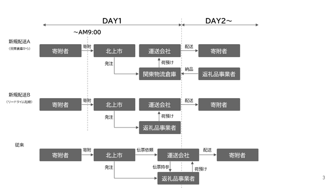 これまで、ふるさと納税においては「お礼の品をすぐに届けてほしい」「お礼の品がいつ届くのかを知りたい」「お礼の品が届く前に連絡が欲しい」といったお礼の品の出荷や配送に関して寄付者から要望の声が上がっていました。これらのニーズに対し、北上市では、寄付者に速やかにお礼の品を届けるため、お礼の品の提供事業者の出荷体制を強化するなど仕組みや環境を整備。これにより、寄付者が午前9時までに寄付申込の決済を完了した場合、当日中にお礼の品を出荷し、最短翌日に寄付者の手元に届くことを実現し、ふるさとチョイス限定で寄付を受け付けることになりました。