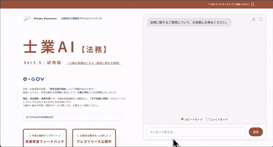 『士業AI【法務】』は、これまでの『士業AI』シリーズと同様、完全無料・会員登録不要で提供いたします。