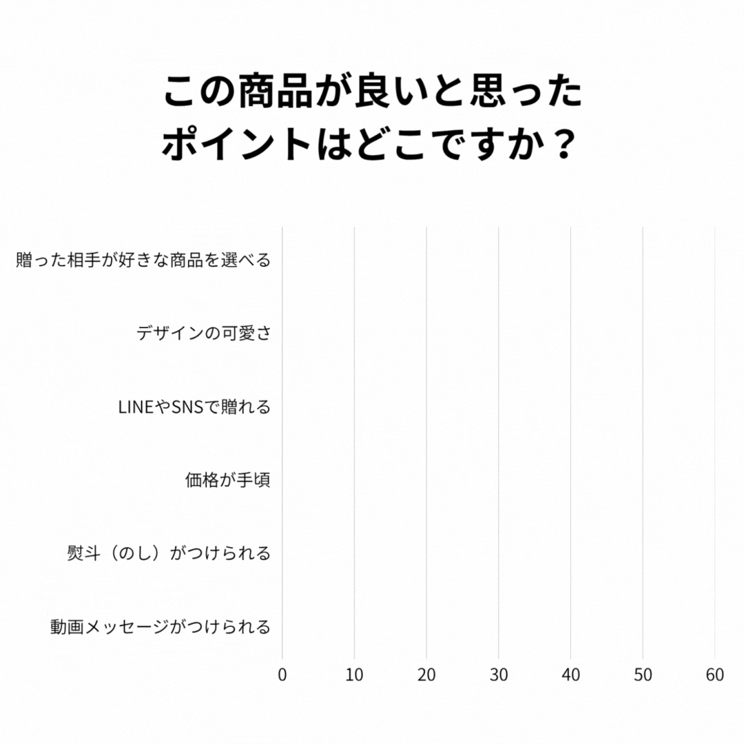 さらに、「デザインの可愛さ」(49人)、「LINEやSNSで手軽に贈れる利便性」(47人)、価格の手頃さ(46人)という点も評価をいただいております。