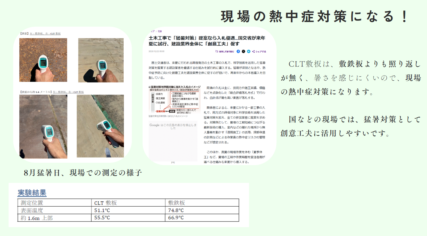 「熱中症対策は“水分・休憩”だけでは足りません。現場の暑さは、足元の対策で大きく変わります。ハイパーCLT敷板を、熱中症対策として使える仮設資材として全国へ届け、作業者の安全と現場の生産性の両立に貢献します」。