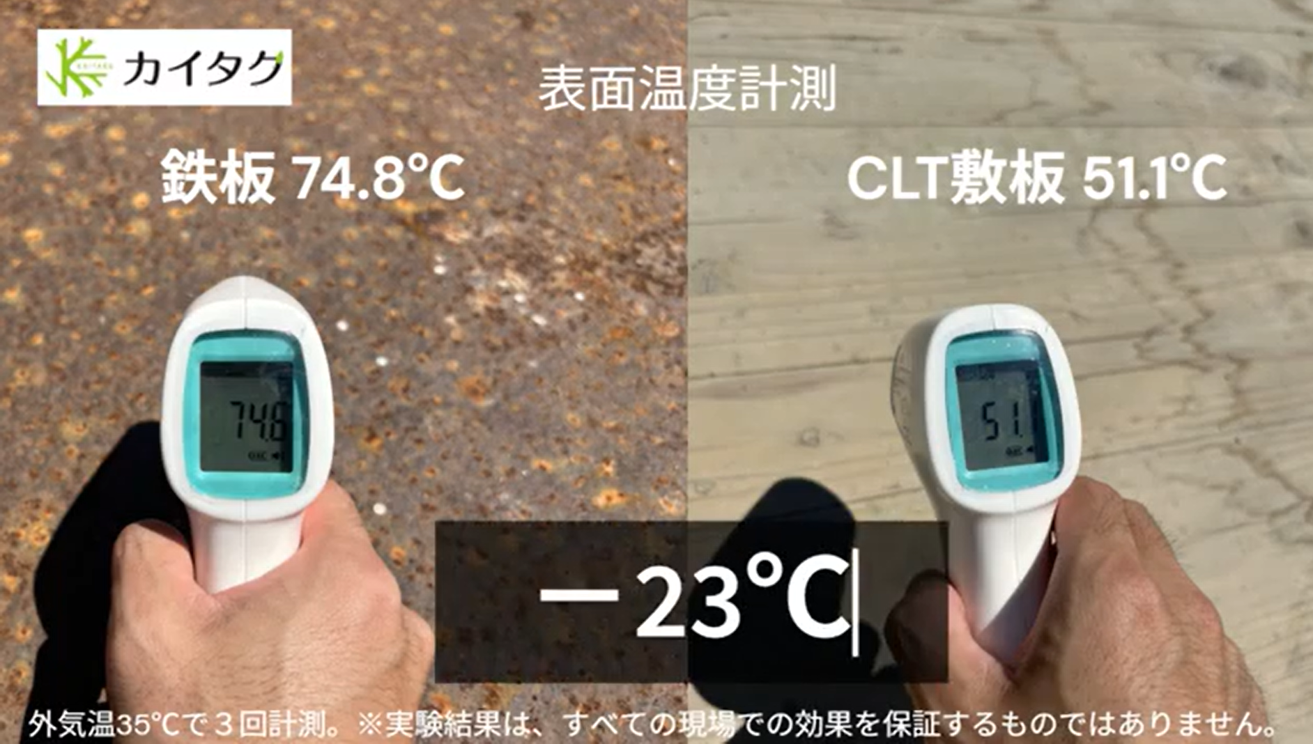 猛暑日に、ハイパーCLT敷板と敷鉄板の体感温度を計測。ハイパーCLT敷板の方が、体感温度が低く。熱中症対策、猛暑対策に効果的だと分かった。
