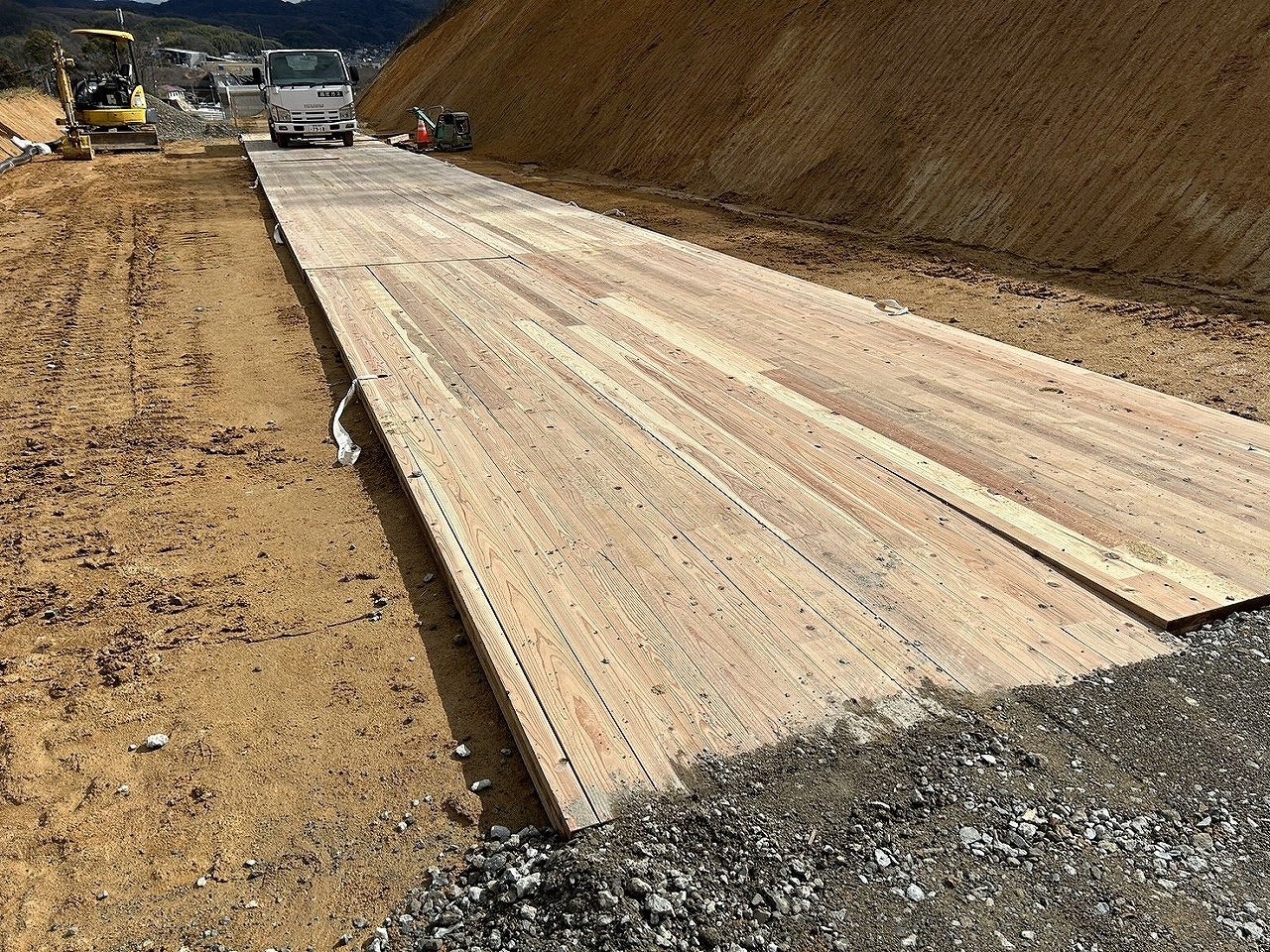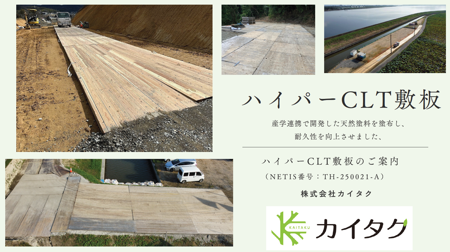 製品名:ハイパーCLT敷板(NETIS登録番号:TH-250021-A)用途:仮設通路/作業ヤード/重機走行路/資材置場 等