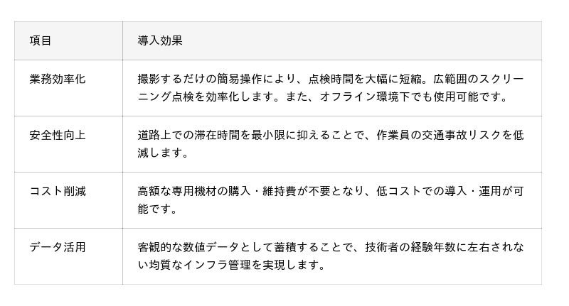 - 高価な専用測定機器や車両を必要とせず、市販のスマートフォン・タブレットで点検が可能です。従来複数人で行っていた作業を作業員一人で完結できるため、大幅な省人化を実現します。