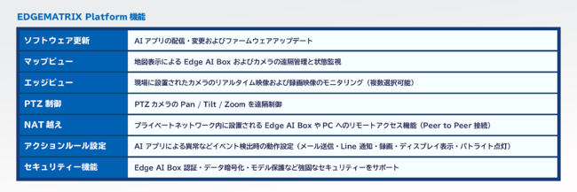 「EDGEMATRIXサービス」は、現場設置の「Edge AI Box」、カメラ、AIアプリ、リモートアクセス、セキュリティ等を統合管理するプラットフォームです。デバイスの遠隔管理、設置場所を地図表示(マップビュー)する状態管理、現場からのAI処理済映像をブラウザに多数同時表示する「エッジビュー」などのサービス管理、AIアプリケーションの配信・管理を行うことができます。