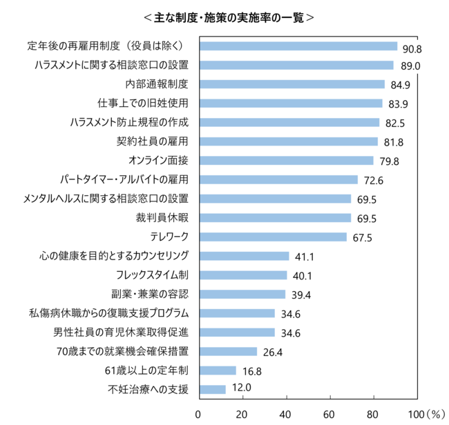 下記のグラフは、本リリースで紹介する19の制度・施策について実施率の高い順に並べたもので、「定年後の再雇用制度」が90.8%、「ハラスメントに関する相談窓口の設置」が89.0%、「内部通報制度」が84.9%などとなっている。