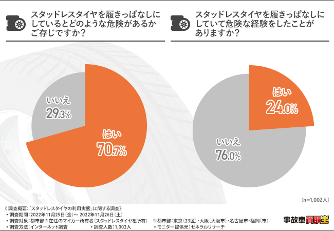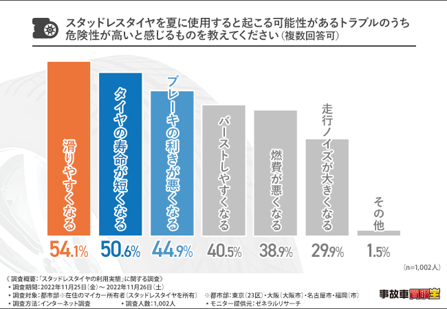 では、スタッドレスタイヤを履きっぱなしにしていると危険だと知っている方はどのくらいいるのでしょうか?