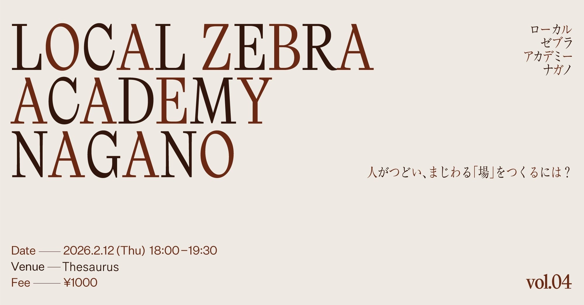 2026年2月12日(木)に「LOCAL ZEBRA ACADEMY NAGANO vol.4 人がつどい、まじわる「場」をつくるには?」を長野市のThesaurusにて開催します。