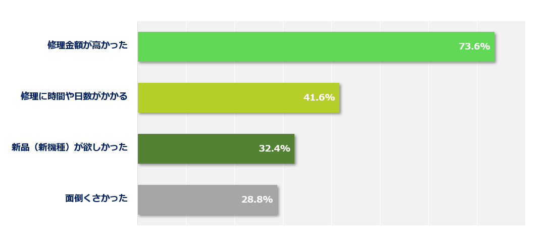 Q:壊れたけど修理を選ばなかったときの主な理由は何ですか?(複数回答可)[画像4: https://prcdn.freetls.fastly.net/release_image/175222/4/175222-4-fd1fe5458e89e9715643b6ca07a151cf-1087x483.png?width=536&quality=85%2C75&format=jpeg&auto=webp&fit=bounds&bg-color=fff ]