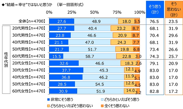全回答者(4,700名)に、“結婚=幸せ”ではないと思うか聞いたところ、「非常にそう思う」が27.6%、「どちらかといえばそう思う」が48.9%で、合計した『そう思う(計)』は76.5%、「全くそう思わない」が5.5%、「どちらかといえばそう思わない」が18.0%で、合計した『そう思わない(計)』は23.5%となりました。結婚することが必ずしも幸せであるとは限らないと感じている人が多いようです。