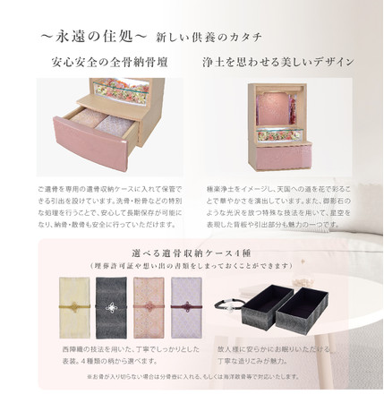 「永代供養」「樹木葬」「散骨」など継承を必要としない埋葬方法に加え、当社が提案するのはご遺骨を自宅で供養することができる新商品「永遠の住処〜Towa no Sumika〜」です。
