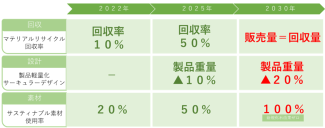 「マテリアルリサイクル」「パッケージの簡素化」「軽量化」を推進し2030年までにすべての製品を100%サスティナブル素材へ切り替え、新規化石由来プラスチックゼロを目指してまいります。