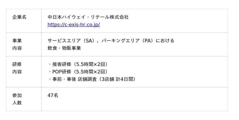中日本ハイウェイ・リテール株式会社(愛知県名古屋市 代表取締役社長 本多亨)における計4回にわたる実践型研修、旗艦店3店舗の事前・事後の店舗調査を終えた成果を公開しました。