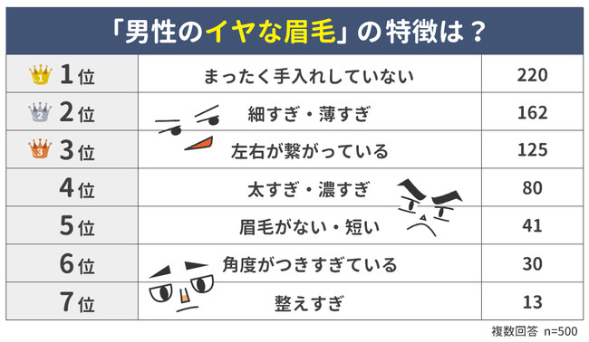 10代以上の女性500人に「男性のイヤな眉毛の特徴」を聞いたところ、1位は「まったく手入れしていない(220人)」でした。