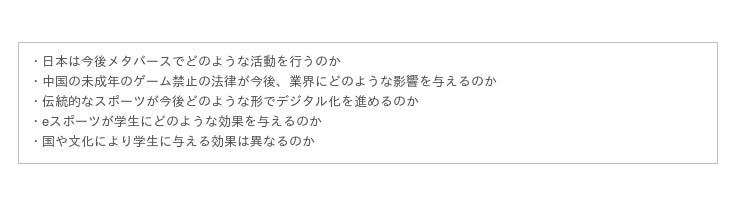 参加者それぞれの専門分野における、日中のeスポーツに関する見解を述べていきます。