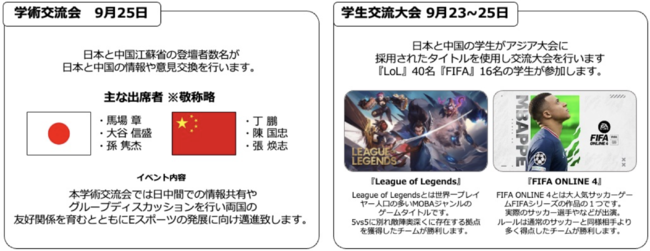 「学生交流大会」では、アジア競技大会に採用されたゲームタイトルを使用し、日本と中国の学生が、9月23日から9月25日の3日間で交流大会を実施します。
