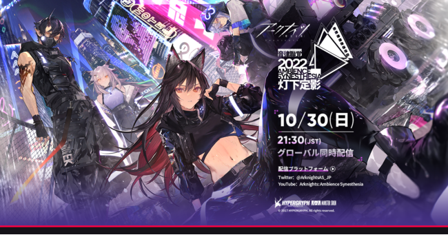 『アークナイツ 音律聯覚』は、スマートフォンゲーム「アークナイツ」の世界観を基にした、音楽やダンス、ホログラフィックなどの要素をふんだんに練り込んだゆえ、バラエティに富んだ大型音楽イベントです。「音律聯覚2022ー灯下定影」は10月30日(日)21:30から、TwitterとYoutubeで同時配信を行いますので、ドクターの皆さん、ぜひお越しください。
