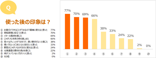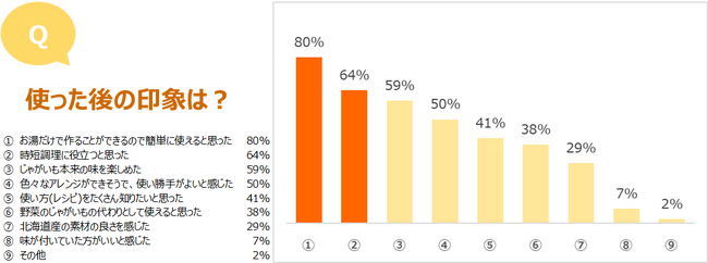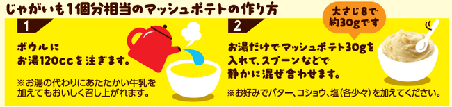 北海道産のじゃがいもをふかしてつぶして乾燥させているので、「皮むき」「ふかし」「マッシュ(つぶし)」が不要で、お湯をまぜるだけでなめらかでホクホクの本格的なマッシュポテトができあがります。さらに、ポテトサラダやコロッケ、グラタンやスープ等の色々なじゃがいも料理も手間を少なく楽しむことができます。