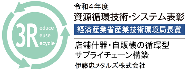 近年、循環経済への転換が急速に進められている中で当社のビジネススキーム、「店舗什器・自販機の循環型サプライチェーン構築」が評価され、受賞に至りました。受賞内容は下記の通りです。