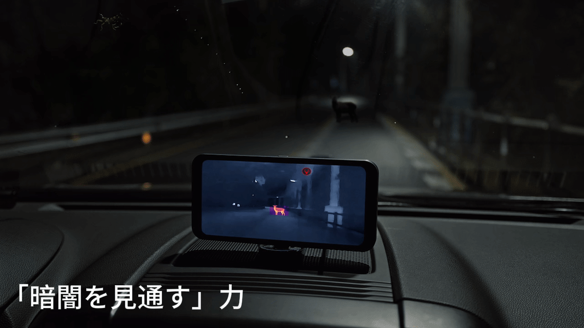 従来のドライブレコーダーでは捉えきれない真夜中の世界。「InsightDrive X1」のサーマルイメージング技術を採用した広視野角カメラ(※)により、極限的な低照度環境でも物体を鮮明に認識。外部光源を必要とせず、動物や歩行者、車両を確実に捉えてスクリーンに表示し、安心の運転体験を実現。[画像5: https://prcdn.freetls.fastly.net/release_image/165948/6/165948-6-2cc34f9e8a4e04d13712d385b366e499-1200x1172.png?width=536&quality=85%2C75&format=jpeg&auto=webp&fit=bounds&bg-color=fff ]